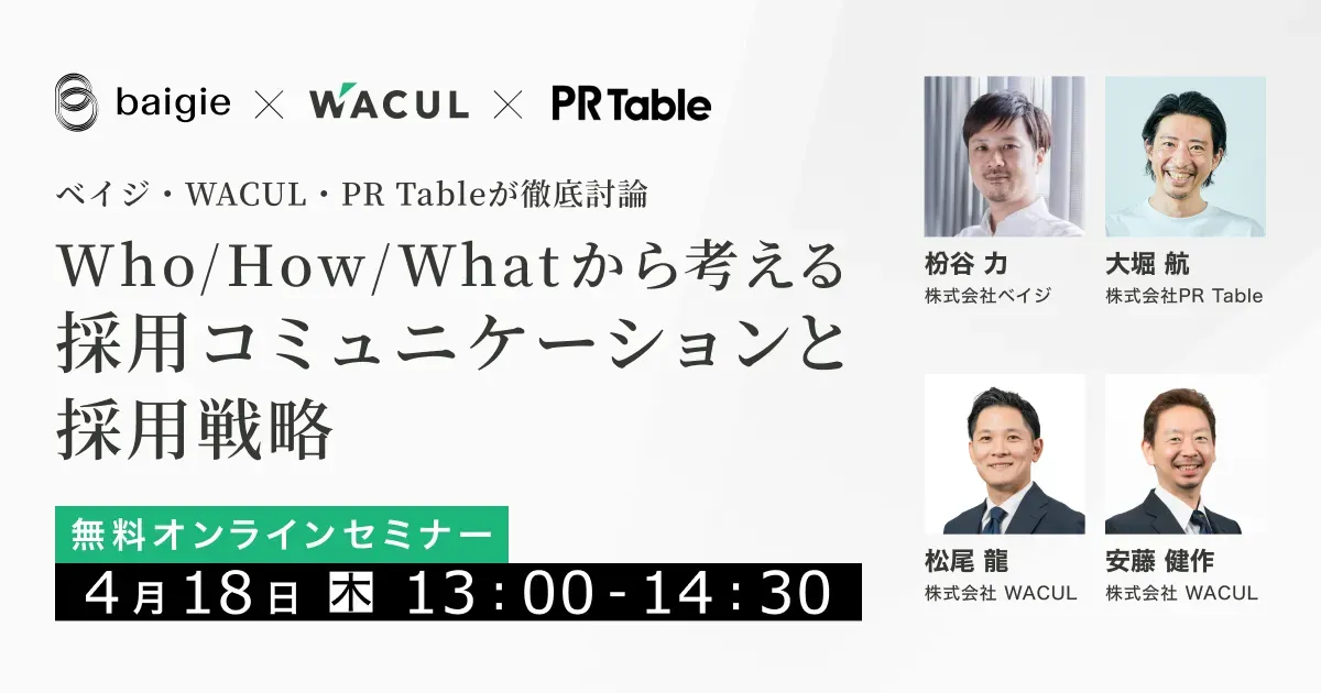 ベイジ社・WACUL社・PR Tableの共催で開催した「Who/How/Whatから考える採用コミュニケーションと採用戦略」セミナーに、当社共同代表取締役の大堀航が登壇しました。
